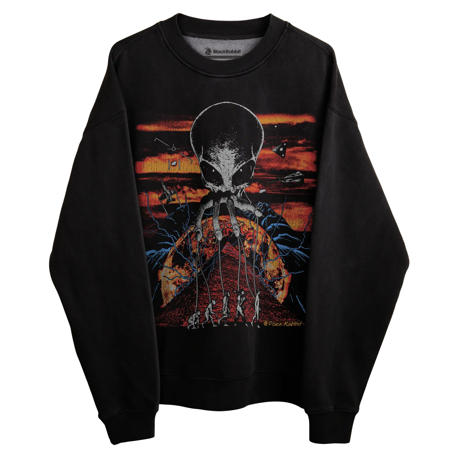 Black sweatshirt with skull design and evolution of man graphic