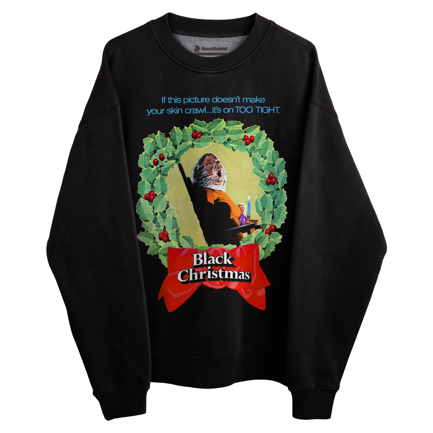 Black sweatshirt with ’black christmas’ design featuring a holly wreath and text.