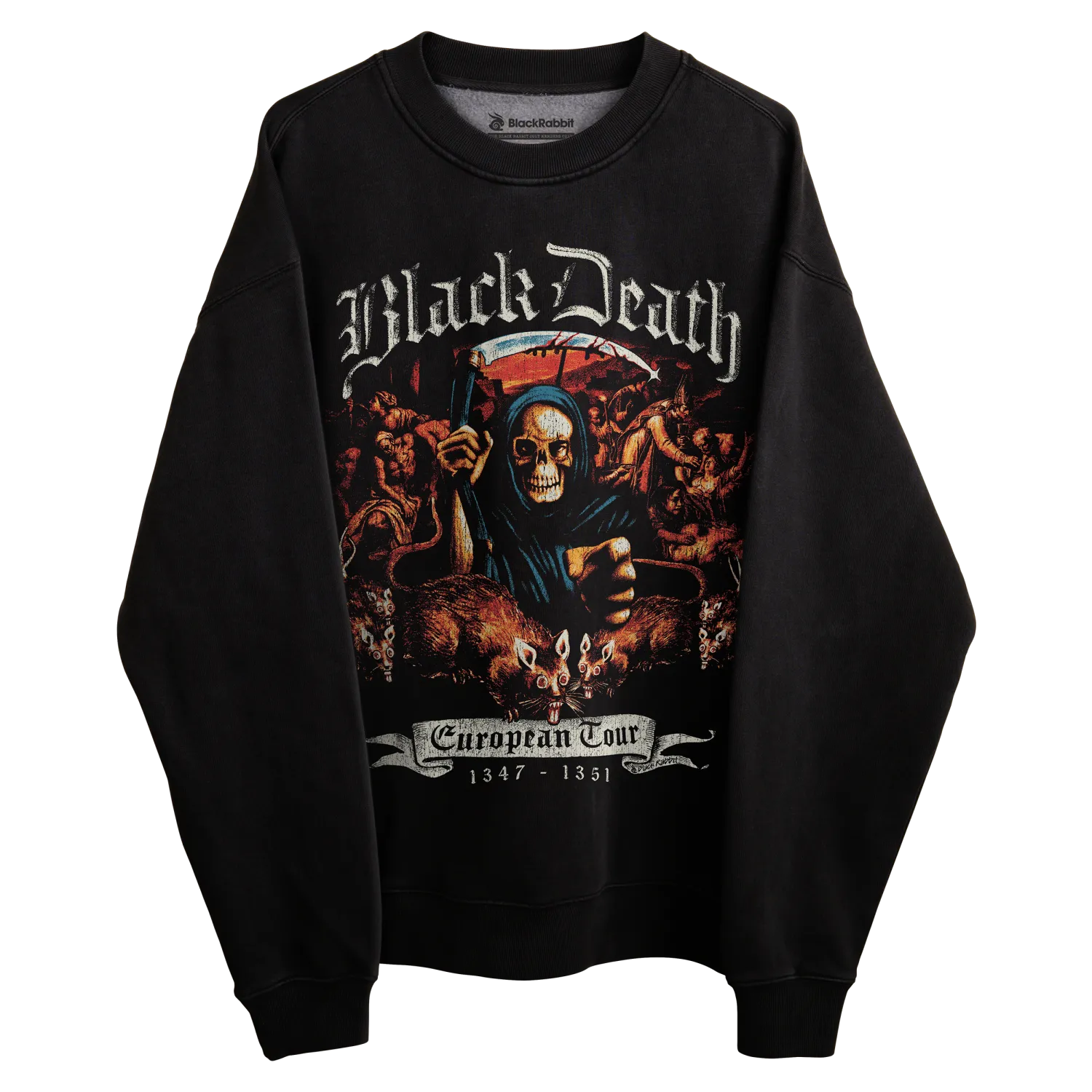 Black sweatshirt with ’black death’ european tour 1347-1851 design, featuring a skull and various figures.