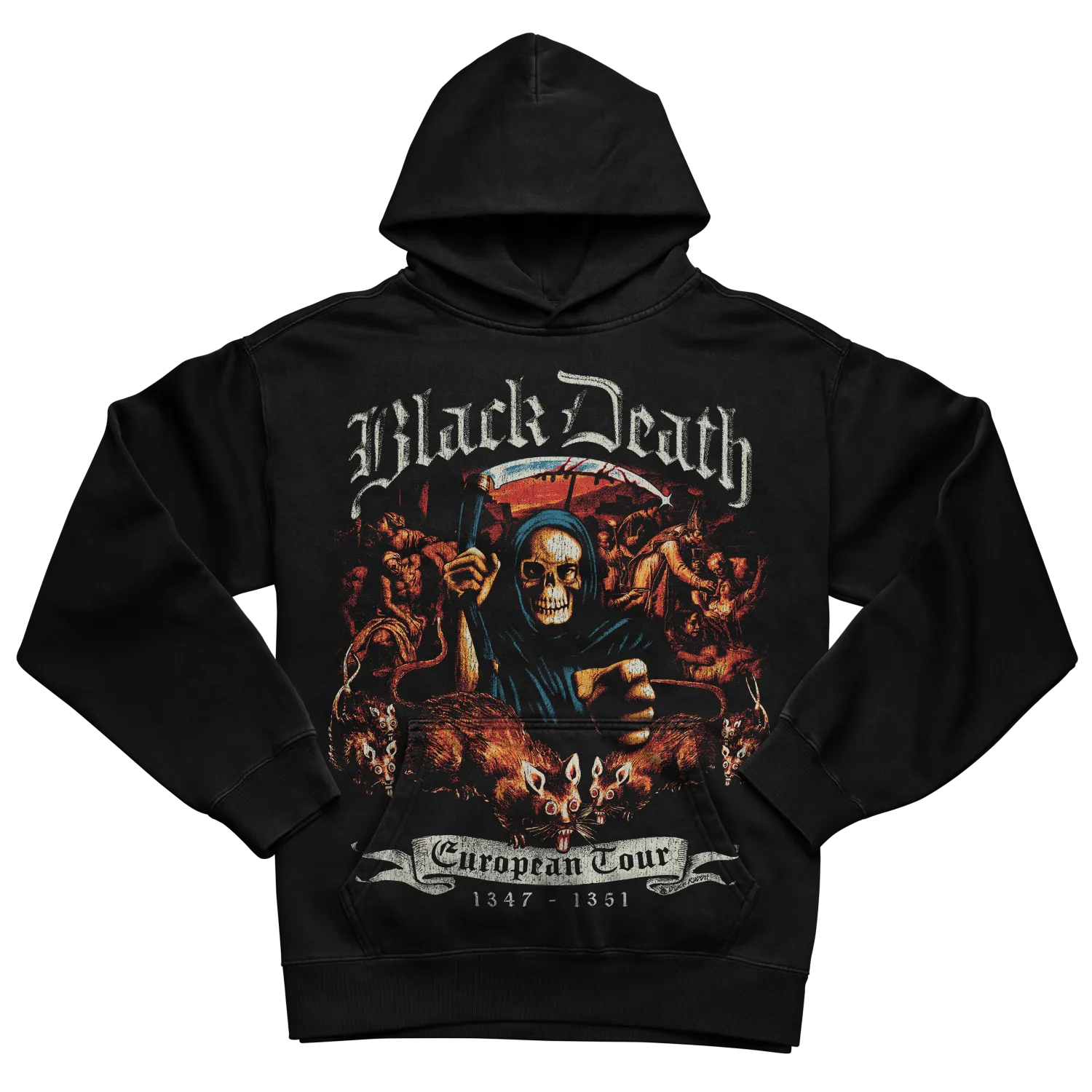 Black hoodie with skull design and ’black death european tour’ text, 1347-1804 date range.