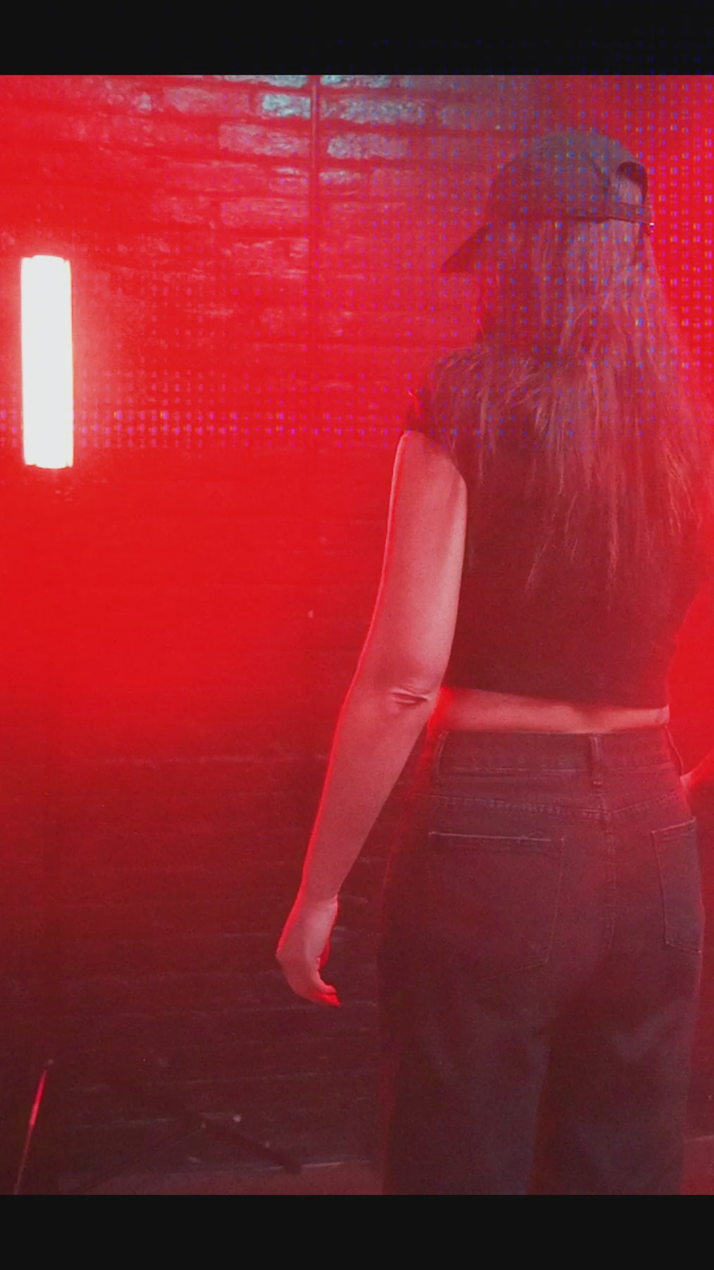 Female model wearing cropped baby tee with black rabbit death metal graphic