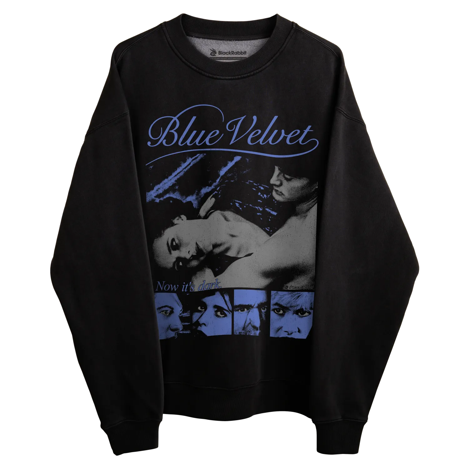 Black ’blue velvet’ sweatshirt with graphic design featuring a couple and stylized faces.