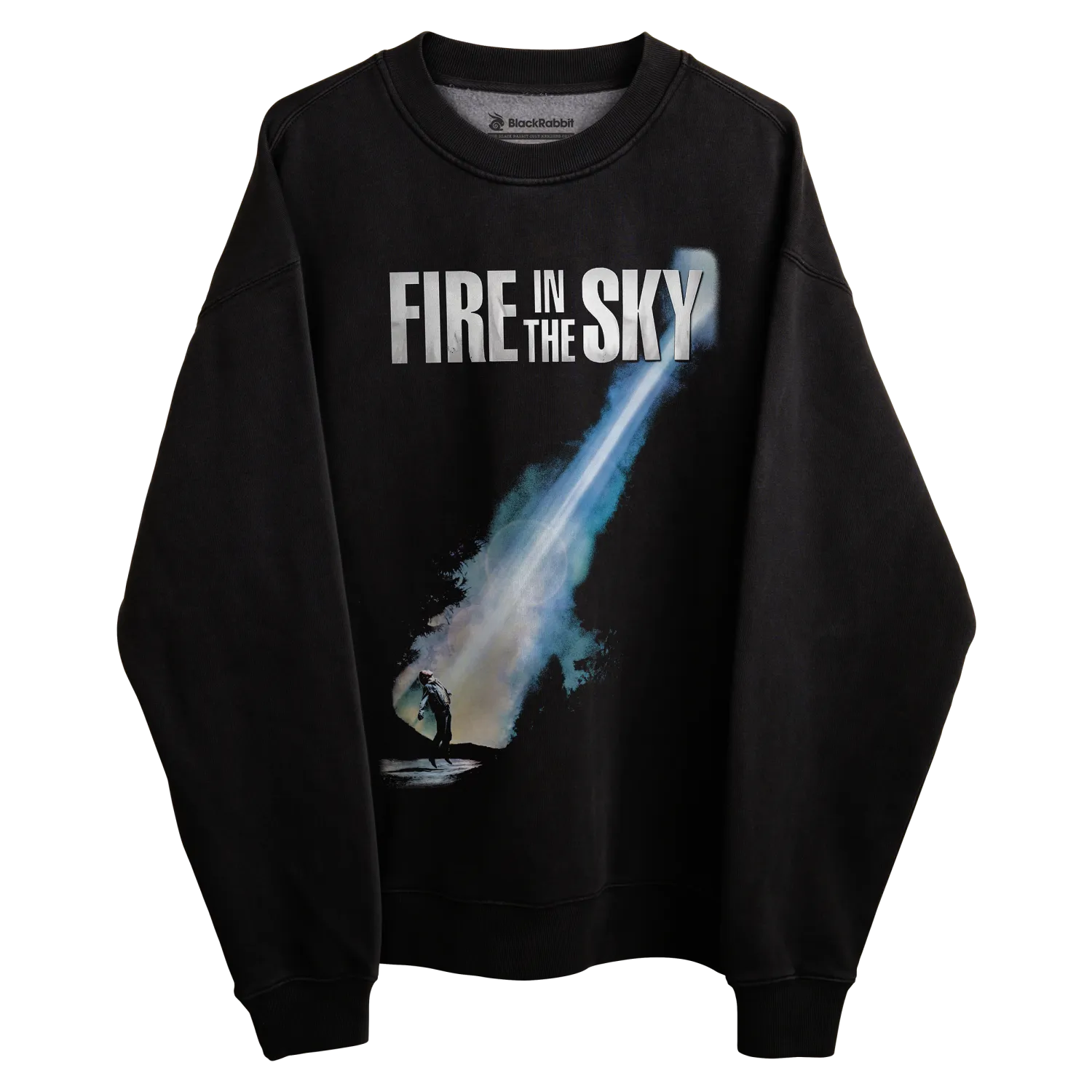 Black long-sleeved sweatshirt with ’fire in the sky’ graphic and comet design, inspired by 1982 film.