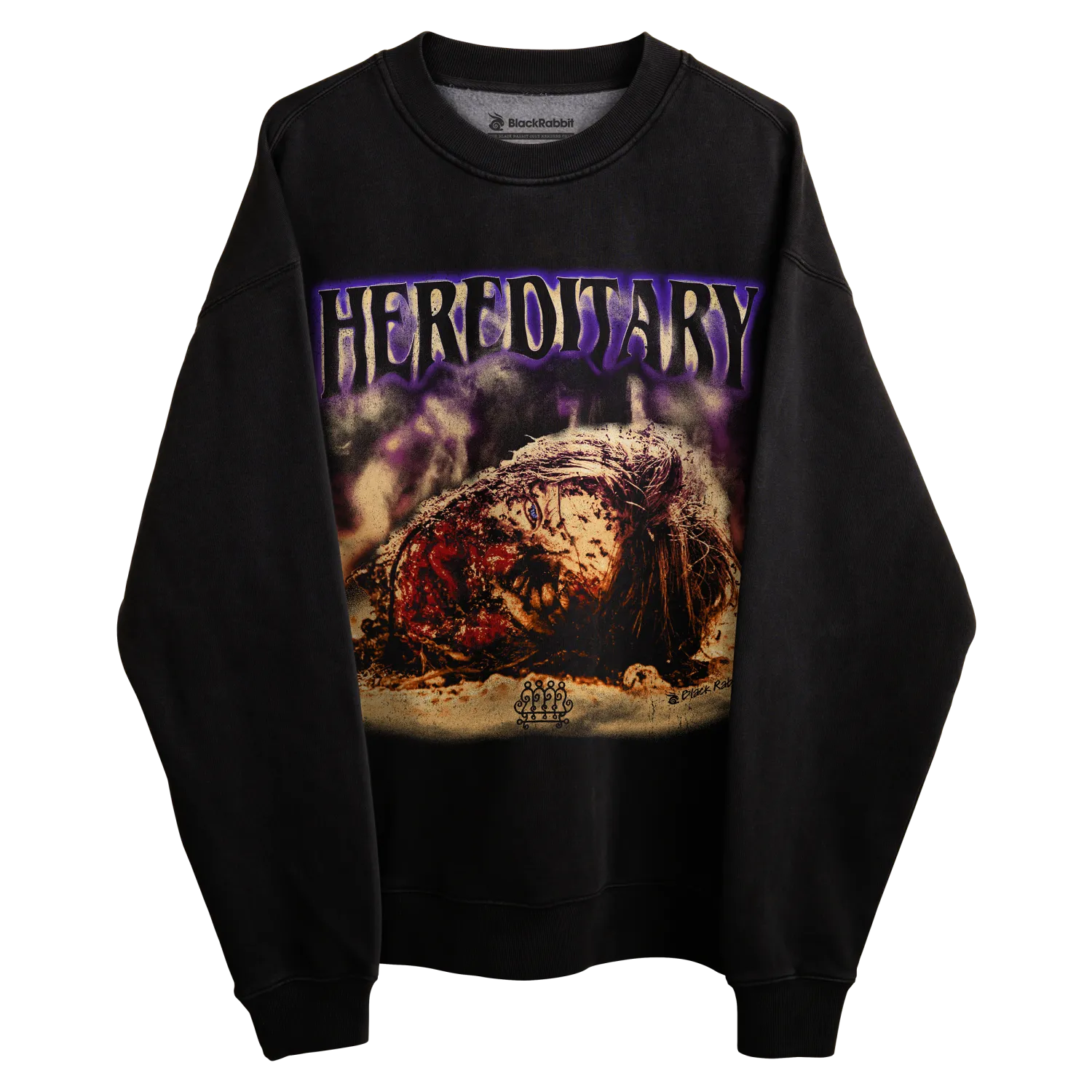 Black crewneck sweatshirt with ’hereditary’ graphic design featuring a horror movie poster print.