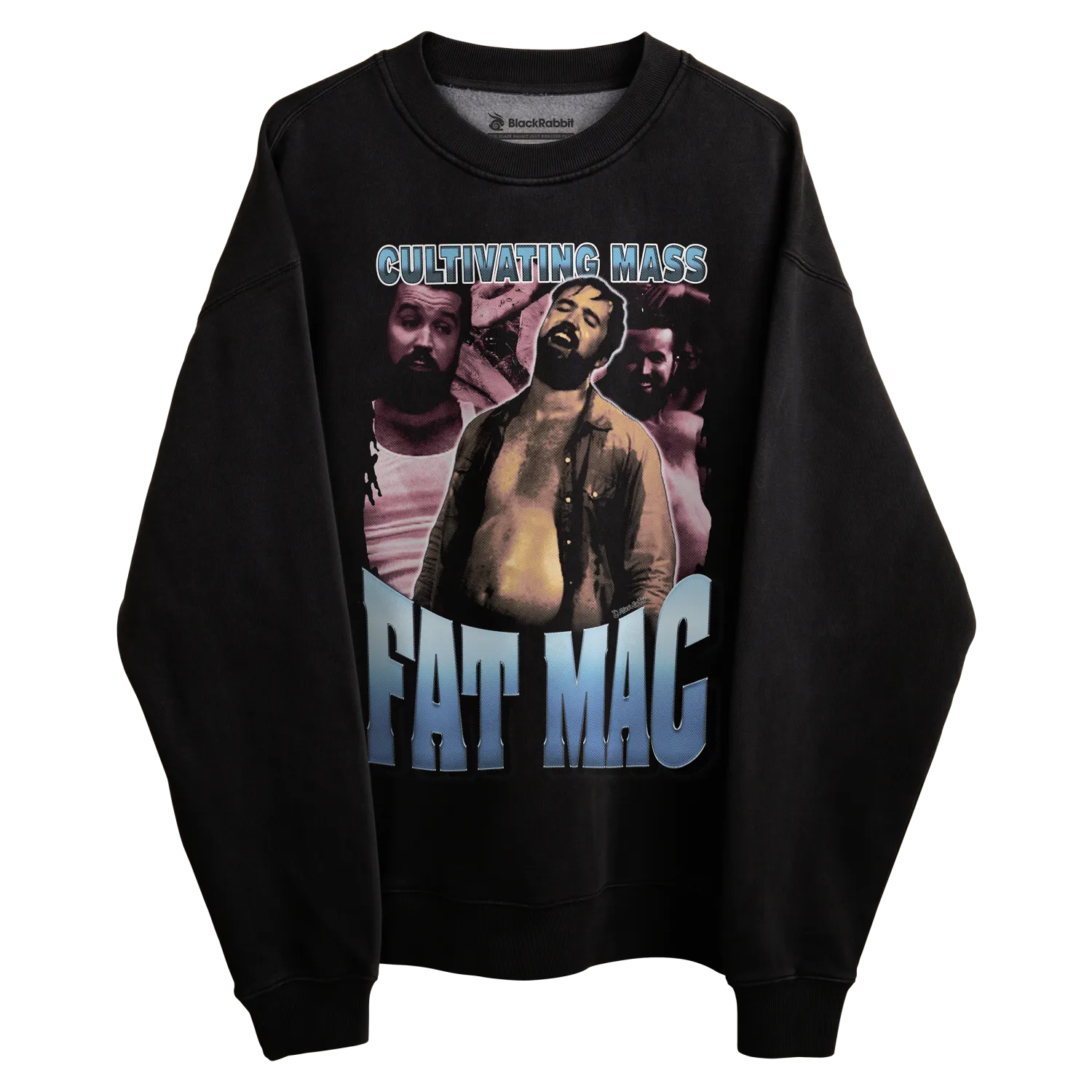 Black crewneck sweatshirt with graphic design featuring a man and text ’cultivating mass’ and ’fat mac.’