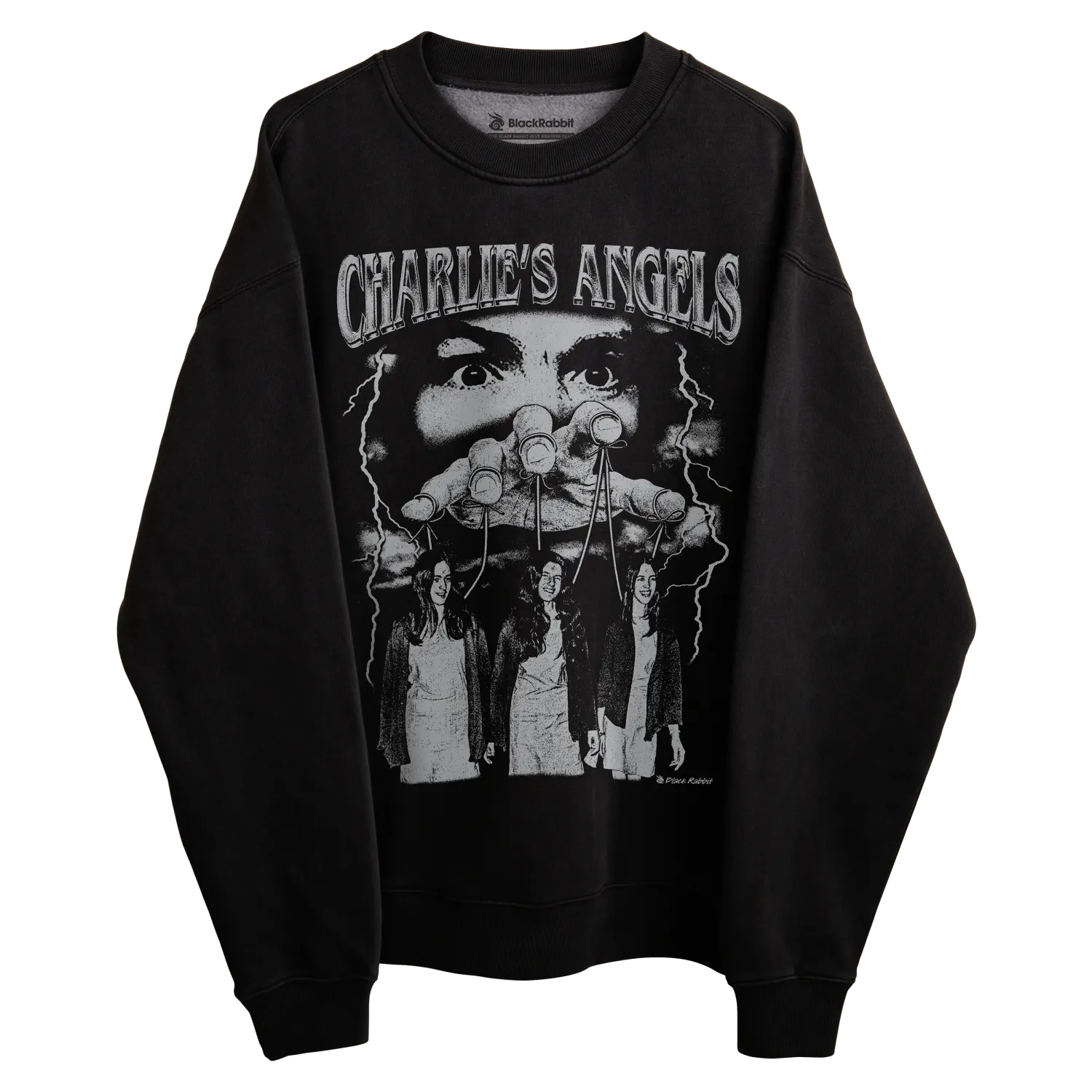 Black long-sleeved sweatshirt with ’charlie’s angels’ graphic design featuring three women and a man, likely made of cotton or polyester blend.