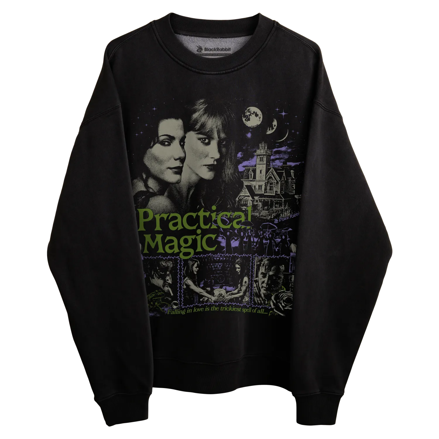 Black sweatshirt with practical magic graphic design featuring two sisters and a haunted house.