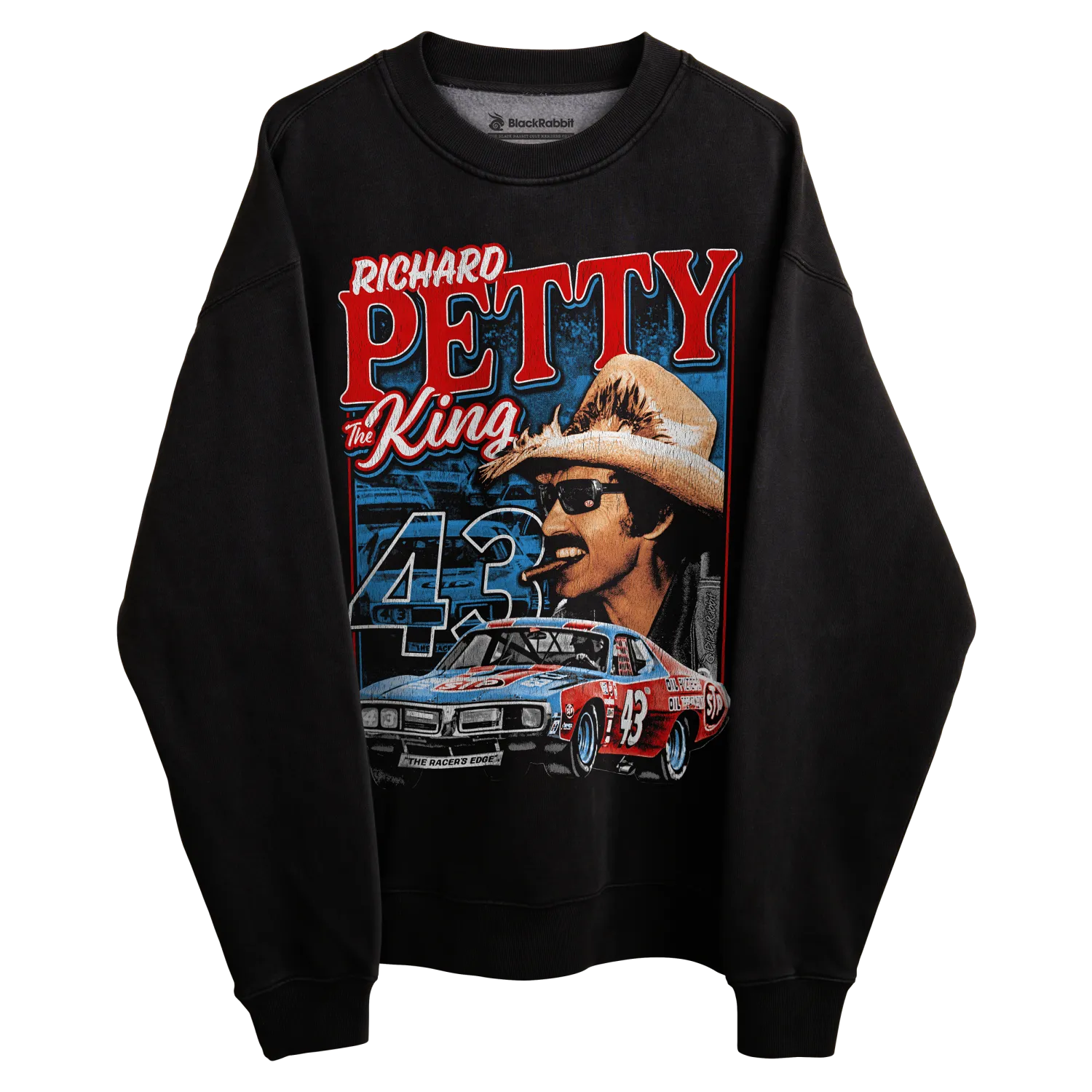 Black crewneck sweatshirt with richard petty design featuring car and number 43, red text.