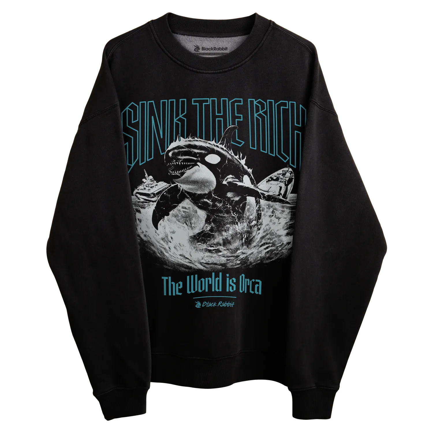 Black crewneck sweatshirt with orca whale graphic and text ’sink the rich’ in teal.