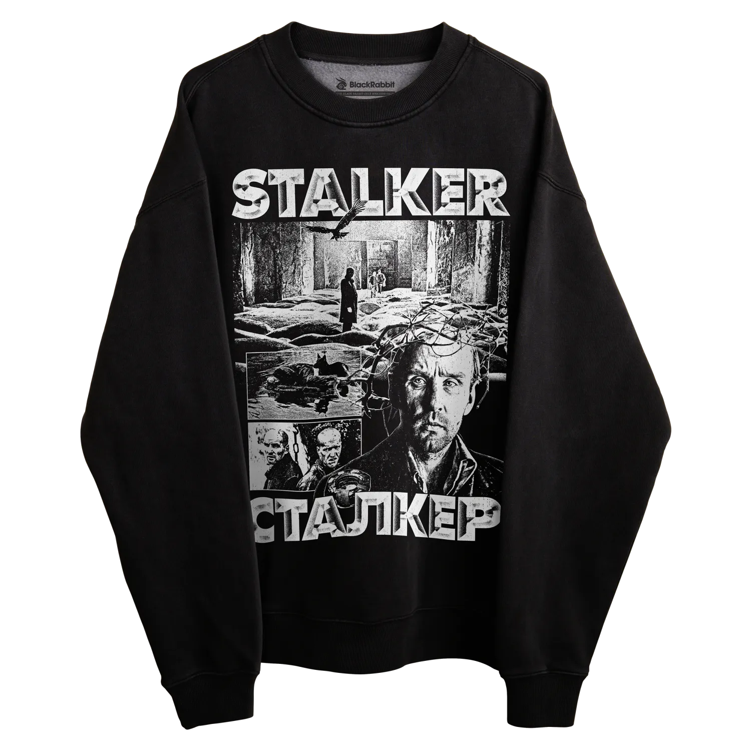 Black long-sleeved sweatshirt with ’stalker’ graphic design featuring multiple scenes and characters from the film.