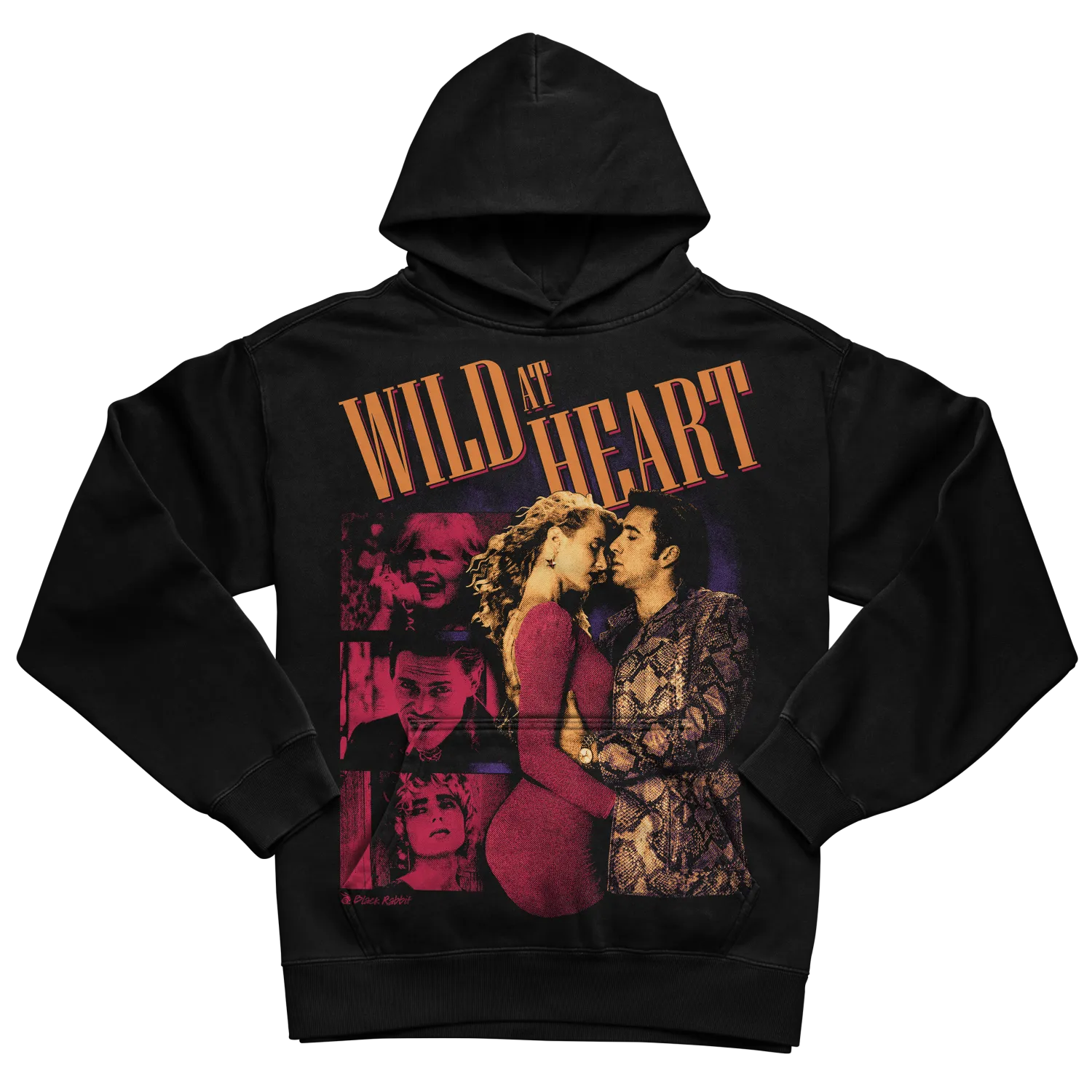 Black hooded sweatshirt with a graphic print featuring a couple embracing and the words ’WILD AT HEART’.