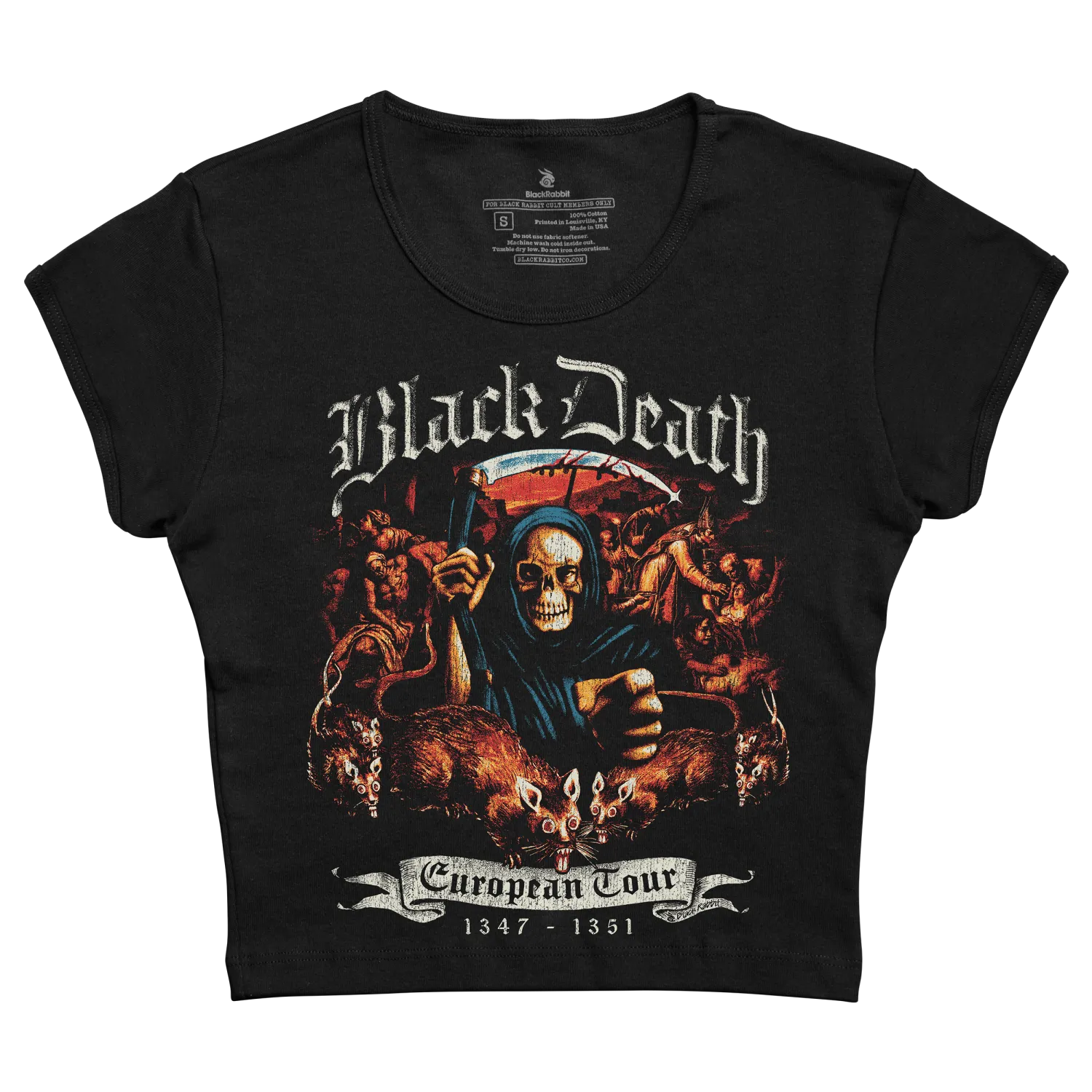 Black death european tour 1347–1351 cropped black t-shirt featuring a detailed graphic of the grim reaper in blue robes holding a scythe, surrounded by rats and demonic figures with red and orange accents.