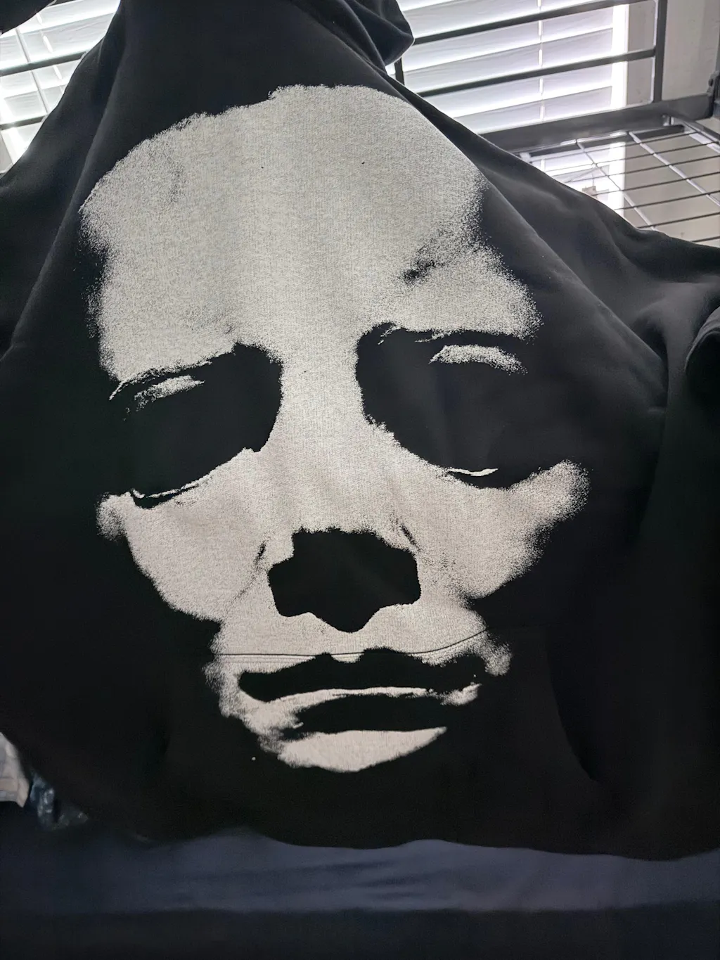 Black michael myers sweatshirt with white face design.