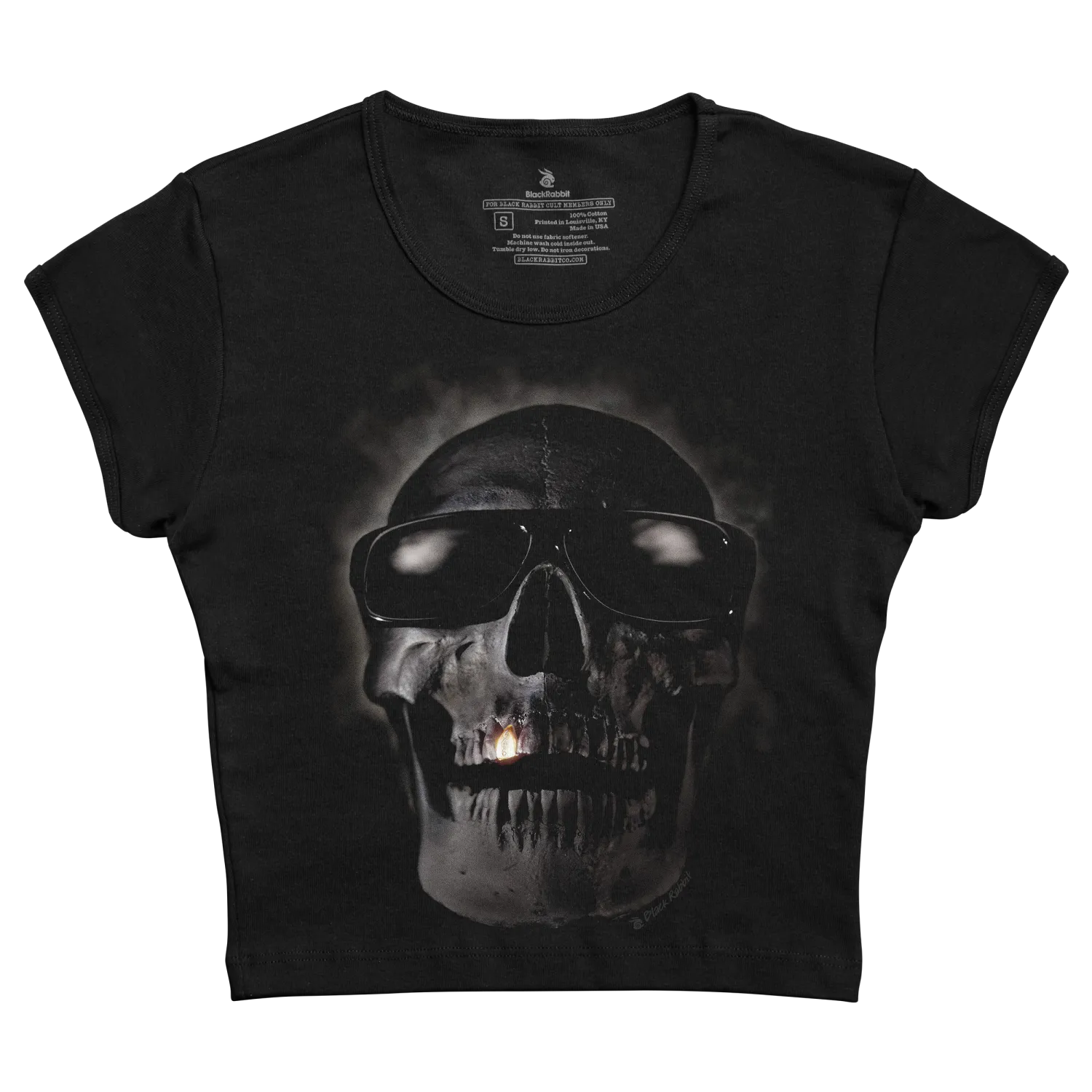 Black short-sleeved t-shirt featuring a detailed grayscale skull wearing sunglasses with glowing eyes and a lit cigarette in its mouth.