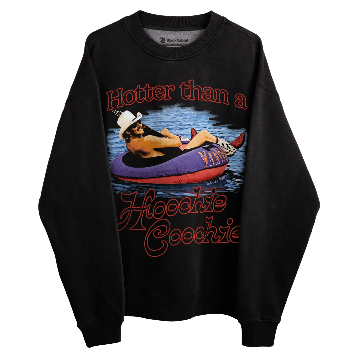 Black sweatshirt with graphic design of woman in inflatable tube on water, ’hotter than a hippie coochie’ text.