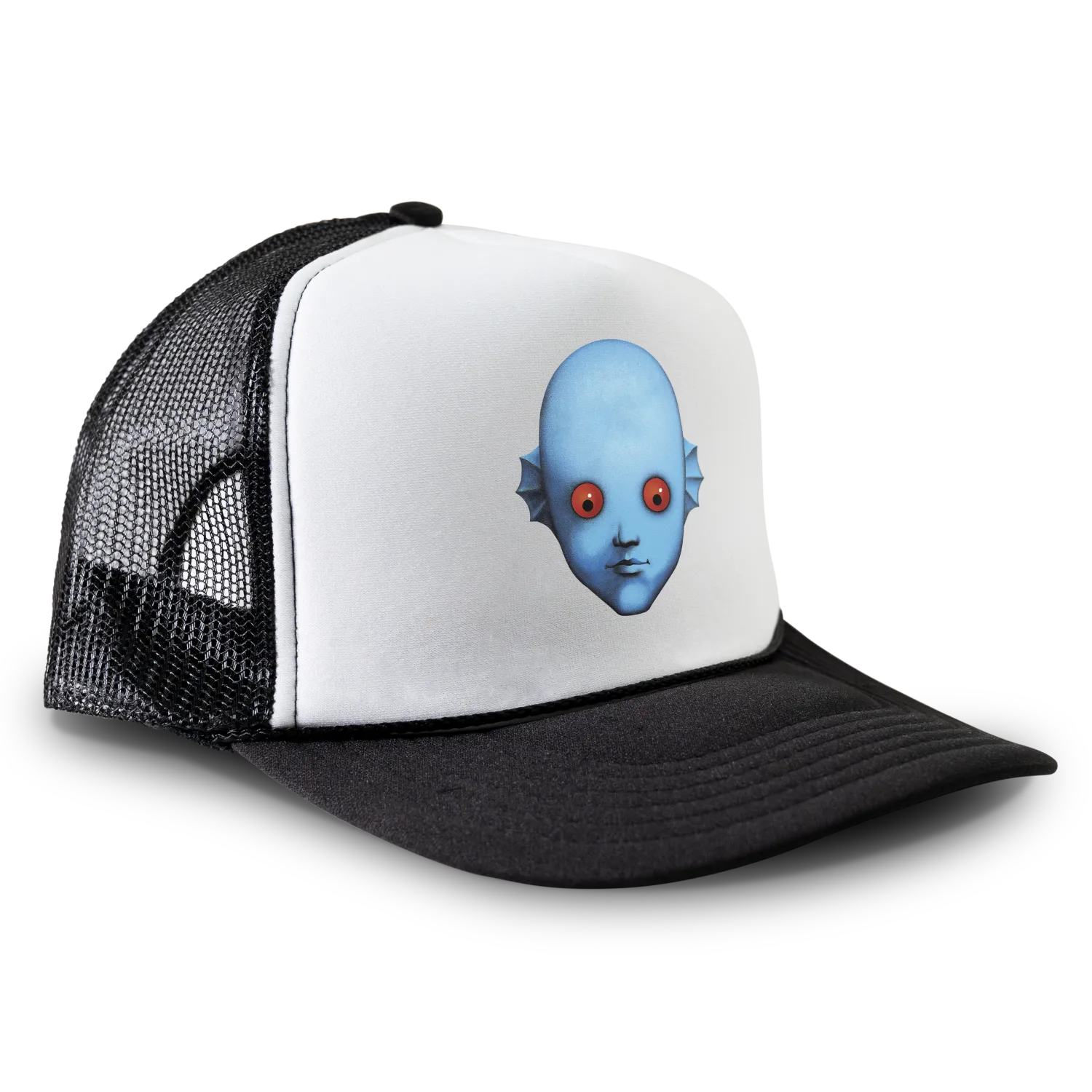 Black and white trucker hat with blue alien face.