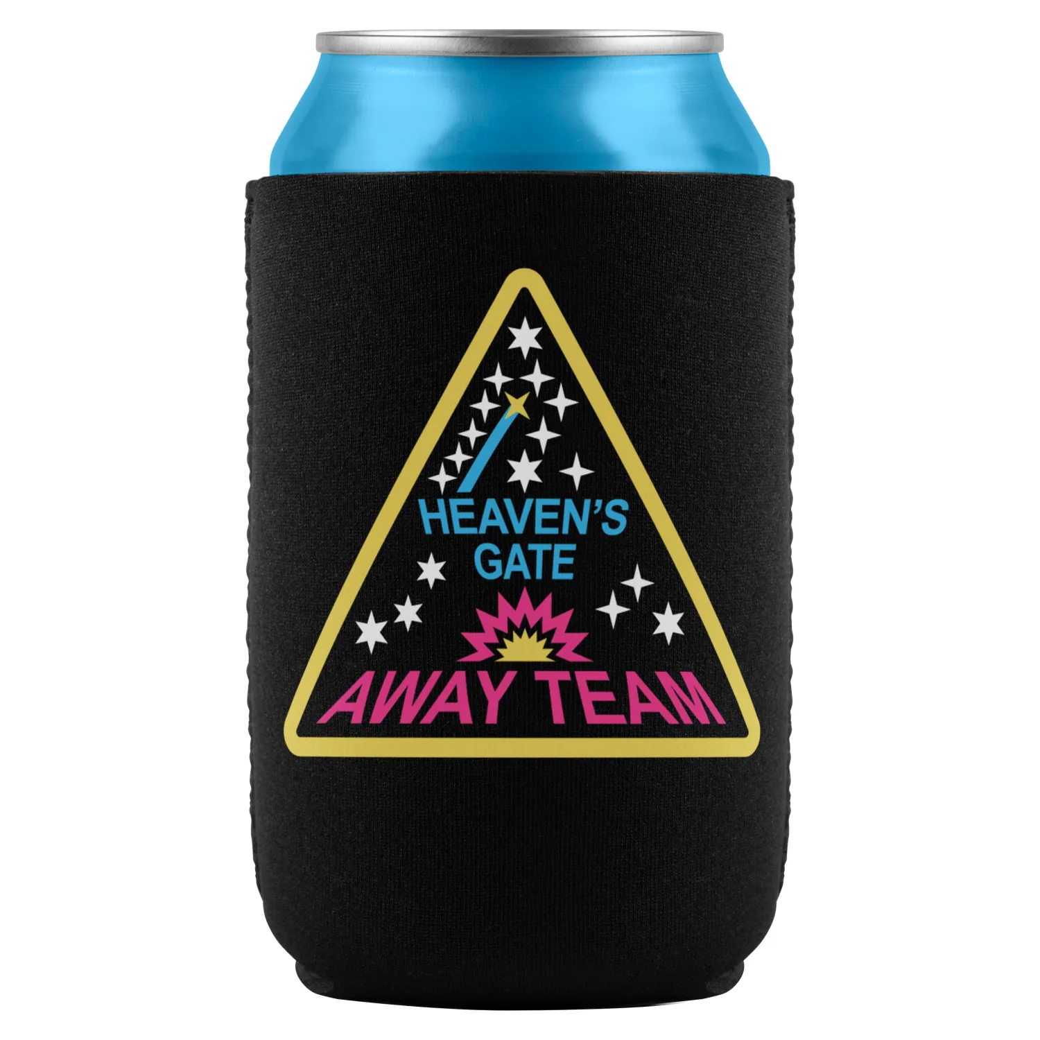 Black can cooler with Heaven’s Gate logo.