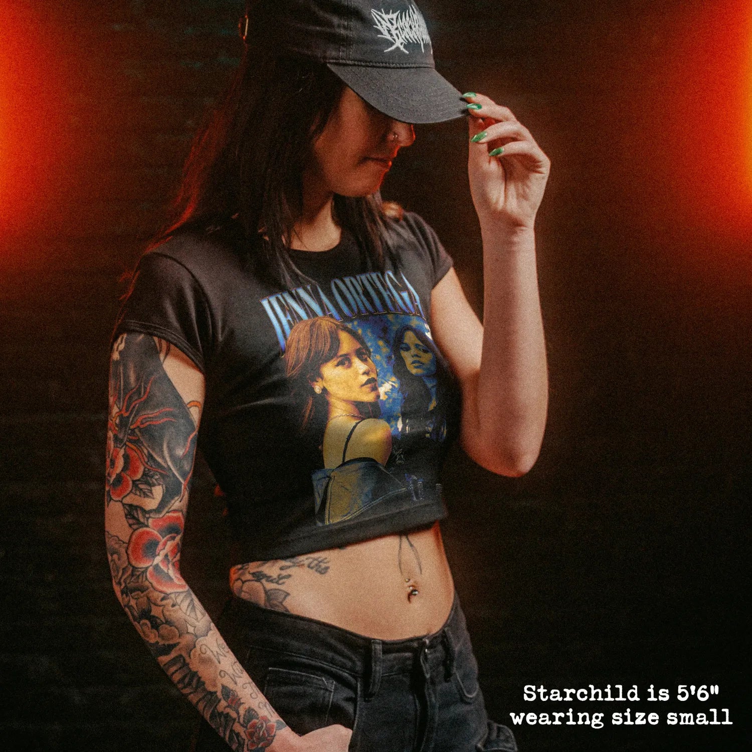Female model wearing cropped baby tee with jenna ortega graphic