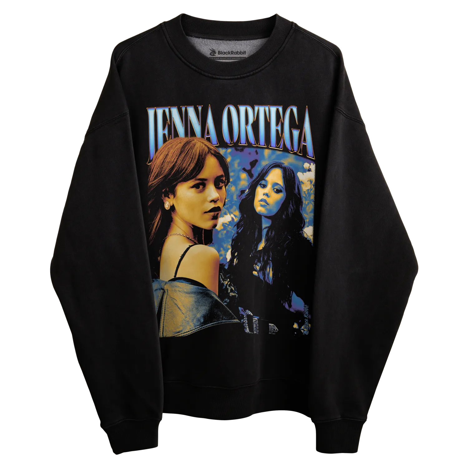 Black short-sleeved t-shirt featuring a vibrant graphic of jenna ortega with stylized blue and white lettering above her image.