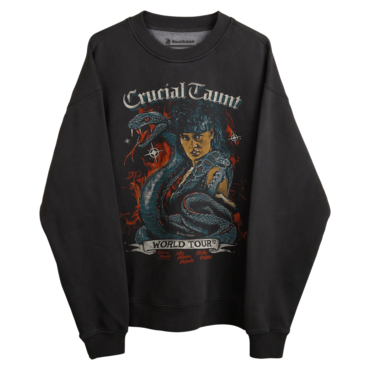 Black sweatshirt with ’crucial taunt world tour’ graphic design featuring a woman and snake, rockabilia brand.